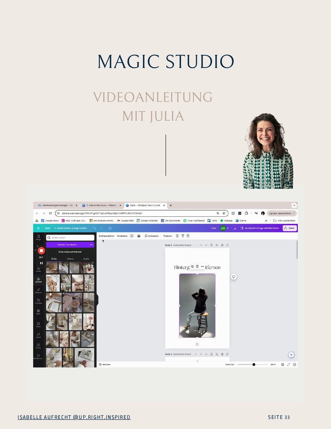 Canva ist eine eingetragene Marke der Canva Pty Ltd. Dieser Kurs steht in keinerlei Verbindung zu Canva selbst. Alle in Canva verwendeten Designelemente unterliegen den jeweiligen Lizenzbedingungen von Canva – bitte informiere dich direkt auf der Website von Canva, welche Nutzungsrechte für kostenlose und kostenpflichtige Elemente gelten.